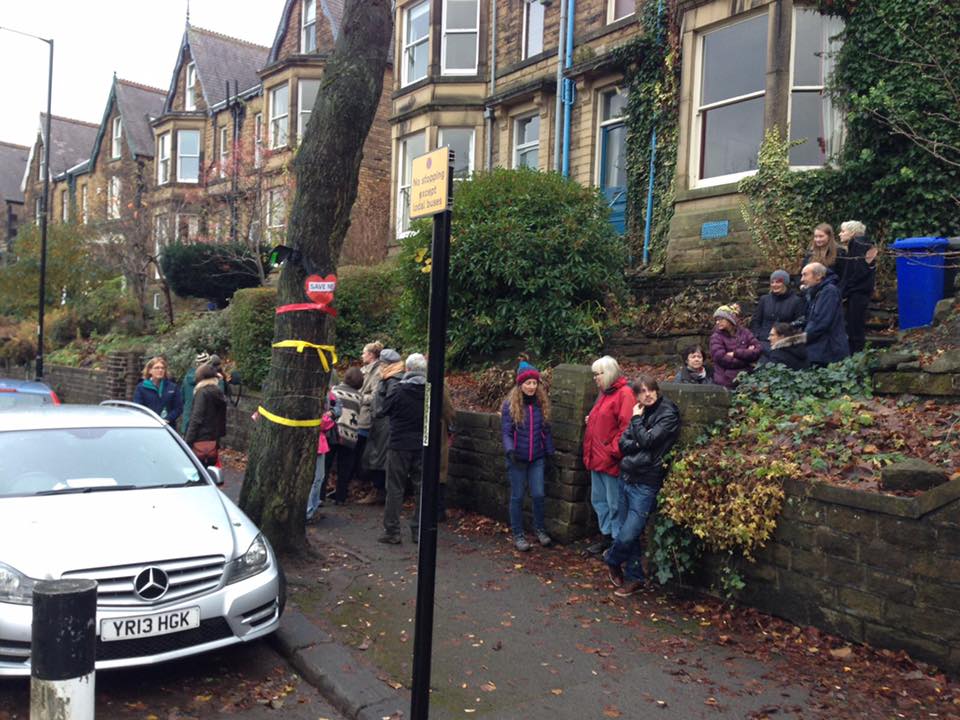 Ellen was saved from felling on that day by Dr Luke Seed and others who stood in his own front garden under the branches of the tree. The other 7 trees, including Delilah and 2 named after James Mitchinson (former editor of The Star and the editor of Yorkshire Post) and cartoonist James Whitworth, were felled.