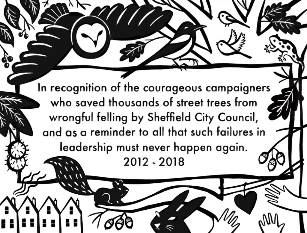 As part of the response to the Lowcock Inquiry into the street tree dispute, the Extraordinary General Meeting of Sheffield City Council in June 2023 agreed that there should be a plaque in the Town Hall entrance to mark the significance of our street tree campaign. A group of campaigners have been meeting for over a year with a Council officer and independent co-chairs to agree the text and design of the plaque. Lydia Monks was chosen as the designer by a competitive process. She is a well-known illustrator based in Sheffield and was part of the street tree campaign.